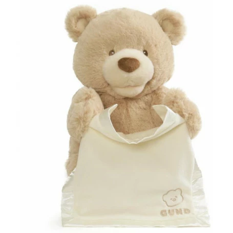 Our animated Peek-A-Boo Bear is a super soft friend ready for a game of peek a boo full of fun and giggles with baby! This 29cm teddy bear with a classic design features a moveable mouth and arms that move up and down during play. At the push of a button, the bear recites one of six different phrases and hides behind the blanket before popping back out to delight baby with an interactive game of peek-a-boo. Peek-A-Boo Bear is surface-washable plush for easy cleaning and appropriate for ages 0+.
