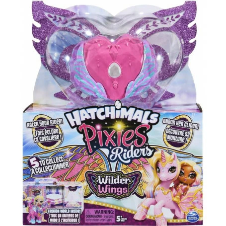 Discover Hatchimals Pixies Riders with even bigger, bolder and more beautiful wings! A glitter storm swirled through Hatchtopia and now the Hatchimals and Pixies have Wilder Wings! The Wilder Wings Pixies Riders all have large glittery wings with gorgeous colorful details, and now you can decorate them with all-new wing accessories! These wild Pixies feature poseable heads and legs, and come with a matching Glider they can really ride! When these bold Hatchimals duos ride together, they measure 3.5 inches tall. Wilder Wings Pixies Riders have a magical unboxing experience. First, hatch the heart to reveal your perfect Pixie. Next, slide the box out of its sleeve and open the fashion world inside! Discover your majestic Hatchimals Glider, then peel the mirror compartment to find 16 wing accessories, both sets of wings, a display stand and an exclusive Hatchtopia Life code to use in the free app (compatible on iOS and Android devices). Easily attach the wings and wing bling onto your Pixie and Glider and customize their looks any way you want! Plus, you can even mix and match accessories on all of the Wilder Wings Pixies Riders! Once youโve unboxed and accessorized your stunning Pixie and Glider, the box becomes a playset, unique to your Pixies Riders duo! You can also flip the heart over and use it to display your new friends in front of their fashion scene. When youโre finished playing, close up the box and take it with you anywhere you go! There are five fabulous Wilder Wings Pixies Riders to collect (each sold separately), including Twins โ one of them is a rare Wildest Chase! Add all of the Wilder Wings Pixies Riders to your collection and go on a wild adventure!