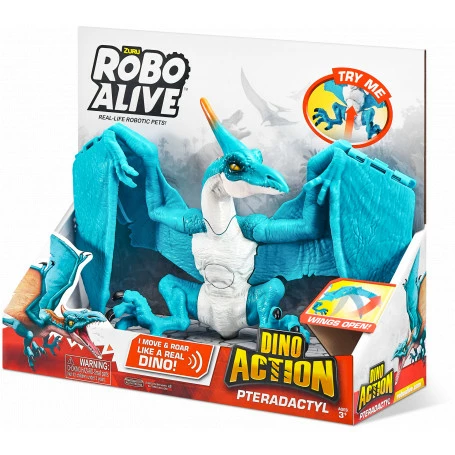 WATCH OUT, the Robo Alive Dino Action Pterodactyl is on the loose! Watch as this Dino moves and roars just like a real Dinosaur! Trigger the tail to watch the dynamic dino arms claw out at prey and wings move to take flight! Then listen closely to hear the ROAR-some dino sounds shake you to your bones! But donโt go too close, or risk becoming the Dinoโs next hunt! This Pterodactyl is nothing like youโve seen before. Thereโs 3 diabolical dinos on the loose ready to attack! Will you tame the terrifying Pterodactyl, raging Raptor, or terrorising T-Rex? Itโs more than alive- Itโs Robo Alive!